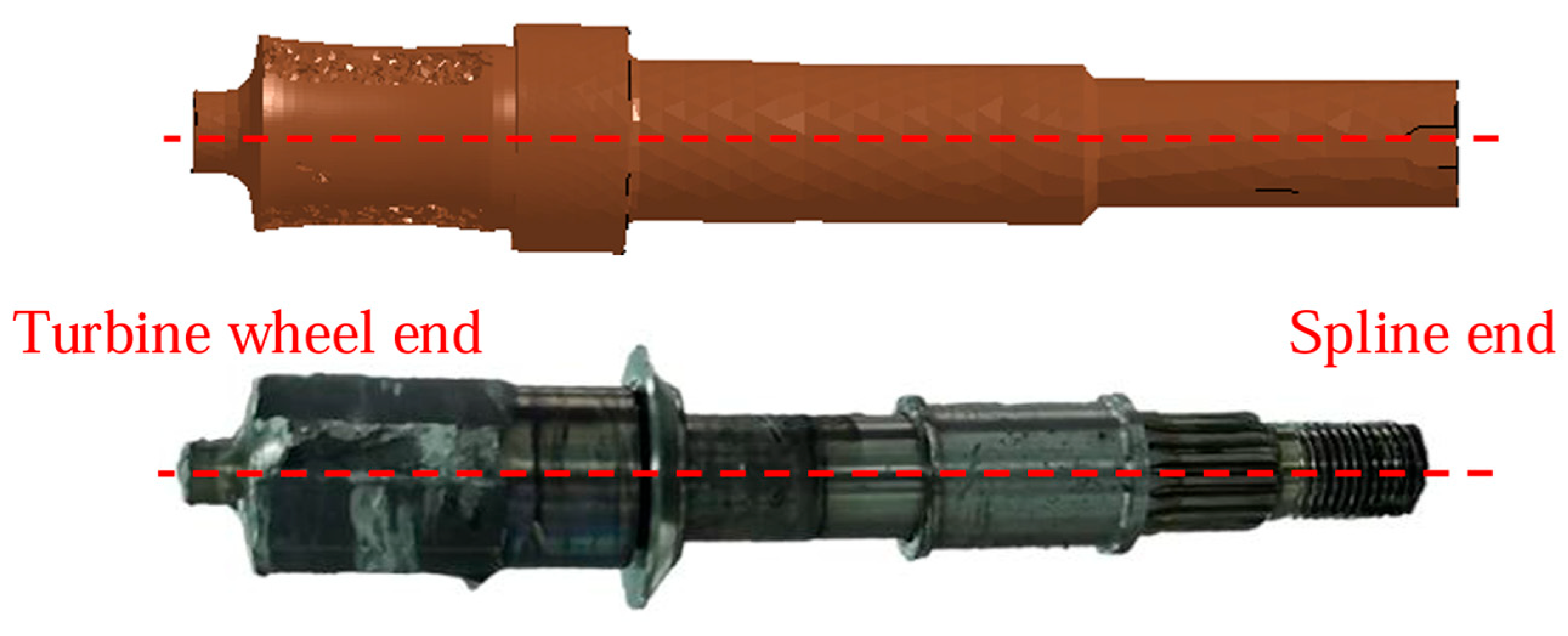 Figure 8 shows that under the large unbalanced loads caused by the wheel burst, the shaft head sways, causing visible bending deformation of the turbine shaft. Simultaneously, the connecting surface between the turbine wheel and shaft is pulled by a large centrifugal load and is thereby broken to form a rough surface.