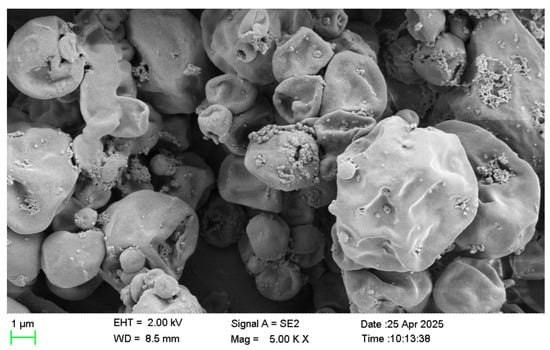 The surface morphology of the MPCM was characterized using a scanning electron microscope (SEM; Zeiss SUPRA 55 SAPPHIRE, Carl Zeiss AG, Oberkochen, Germany). As shown in Figure 1, the SEM image reveals the structural features of the MPCM sample. To allow for volume variations during core material phase transitions, the microcapsules were designed with a loose wall structure containing voids, enabling deformation under pressure and resulting in observable surface depressions.