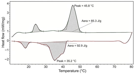 The phase change temperature and latent heat of the MPCM were measured using a differential scanning calorimeter (DSC; NETZSCH DSC 214 Polyma, NETZSCH-Gerätebau GmbH, Selb, Germany). As depicted in Figure 2, the melting point was approximately 45.8 °C with a latent heat of 85.3 J/g, while the solidifying point was approximately 35.2 °C with a latent heat of 92.9 J/g.