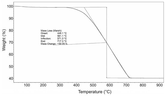 The thermogravimetric analysis (TGA) of the MPCM is conducted using a thermal analyzer (NETZSCH STA 449 F3 Jupiter, NETZSCH-Gerätebau GmbH, Selb, Germany). As presented in Figure 3, the MPCM samples exhibit great thermal stability. A significant weight loss of the MPCM is observed between 446.1 °C and 717.3 °C due to the gasification of the PCM.