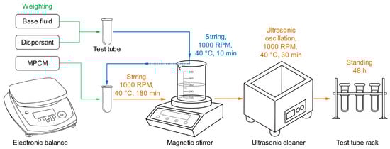 According to the predetermined mass fractions of MPCM and dispersant, the required masses of MPCM, dispersant, and base fluid were accurately weighed using a high-precision electronic balance (Shenzhen Meifu Electronics Co., Ltd., Shenzhen, China), MTS 2000, 0–2000 g, ±0.1 g).