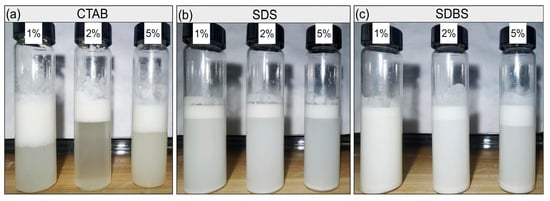 To select the optimal dispersant, three common dispersants (CTAB, SDS, and SDBS) were evaluated at mass fractions of 1%, 2%, and 5% in the MPCMS containing 10% MPCM, with DI water serving as the base fluid. The dispersants used were CTAB (Tianjin Balance Biotechnology Co., Ltd., Tianjin, China, AR), SDS (Sinopharm Chemical Reagent Co., Ltd., Beijing, China, AR), and SDBS (Sinopharm Chemical Reagent Co., Ltd., Beijing, China, AR). The effects of these dispersants on the uniformity of the MPCM dispersion in the base fluid were systematically investigated. As illustrated in Figure 5, when CTAB served as the dispersant, MPCMS demonstrated complete phase separation and exhibited the lowest homogeneity. In the case of SDS, partial phase separation accompanied by sedimentation was observed. By contrast, the use of SDBS as the dispersant resulted in a significant improvement in MPCMS homogeneity, especially at a mass fraction of 1%. Therefore, SDBS was chosen as the dispersant for this study, with its concentration set at 1% mass fraction.