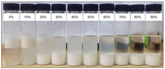 Due to the significant density difference between DI water and MPCM, achieving a long-term uniform distribution state is challenging even with the assistance of a dispersant when using DI water alone as the base fluid. In this study, the density difference between the base solution and MPCM was minimized by adjusting the density of the base fluid with an appropriate amount of NPA in DI water. The uniformity of MPCMS was evaluated at different NPA contents, with mass fractions controlled at 10% intervals. As shown in Figure 6, from left to right are MPCMS samples with NPA mass fractions ranging from 0% to 90% after 48 h of standing. It can be observed that MPCM floats significantly above the base fluid when the NPA mass fraction is less than or equal to 20%. Conversely, when the NPA mass fraction is greater than or equal to 30%, MPCM predominantly sinks below the base solution. Based on these observations, it can be inferred that the optimal range of the NPA mass fraction lies between 20% and 30%.