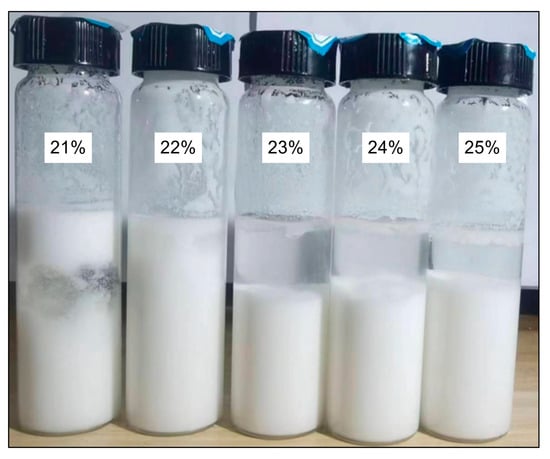 To further determine the optimal NPA mass fraction, control tests for MPCMS homogeneity were conducted at 1% intervals. As shown in Figure 7, from left to right are MPCMS samples with NPA mass fractions ranging from 21% to 25% after standing for 48 h. It can be observed that when the NPA mass fraction is between 23% and 25%, MPCMS predominantly sinks below the base fluid. When the mass fraction is 21%, MPCM exhibits both floating and sinking behavior. The highest uniformity of MPCM is achieved when the mass fraction is 22%. Therefore, the optimal composition of the base fluid is determined to be 22% NPA and 78% DI water.