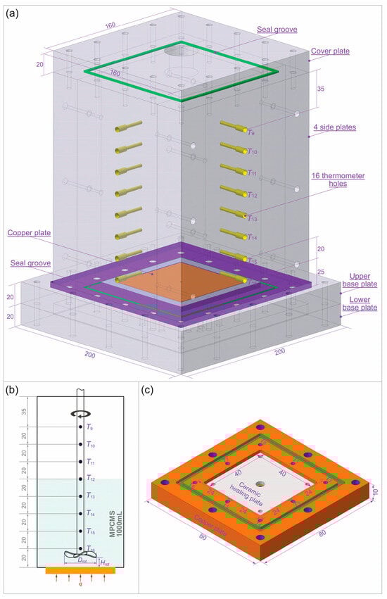 As shown in Figure 9a, the test section comprises a copper plate, an upper base plate, a lower base plate, a top cover, and four side plates. Except for the copper plate, all other components are made of transparent PC material to facilitate visual observation. The upper and lower base plates measure 200 mm × 200 mm × 20 mm, while the top cover has external dimensions of 160 mm × 160 mm × 20 mm and features a central through-hole with a diameter of 20 mm for the stirring shaft to access the interior of the test section. The four side plates are 200 mm high and 30 mm thick, with two plates measuring 160 mm wide and the other two 100 mm wide. Each side plate has eight equally spaced stepped through-holes (20 mm apart): 3 mm in diameter and 20 mm deep at the front, transitioning to 5 mm in diameter and 10 mm deep at the rear. Thermal resistors (3 mm in diameter and 30 mm in length) are inserted into these holes, fixed, and sealed with glue. The specific positions of the thermal resistors, numbered 9–16, are illustrated in Figure 9b. The assembly is completed using bolts, O-rings, and glue, resulting in an internal space of 100 mm × 100 mm × 200 mm.