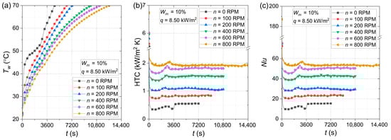 Figure 10 shows the dynamic variation in Tw, h, and Nu with heating time (t) at n = 0–800 RPM, Wm = 10%, and q = 8.50 kW/m2. Without stirring (n = 0 RPM), the Tw curve exhibits melting characteristics similar to those of pure PCM, divided into three stages: solid-phase sensible heat transfer, latent heat transfer, and liquid-phase sensible heat transfer. With stirring initiated (n > 0 RPM), as n increases, the transitions between these stages gradually diminish, indicating that stirring alters the melting behavior of MPCMS. For HTC and Nu, they are initially high during the early heating stage, then decrease rapidly before gradually stabilizing. At n = 800 RPM, the stable values are 1.94 kW/m2 K and 53.685, respectively, representing a 252.7% increase relative to the corresponding values of 0.55 kW/m2 K and 15.22 at n = 0 RPM. Overall, higher n leads to lower Tw and higher HTC and Nu, demonstrating that stirring enhances the convective heat transfer.