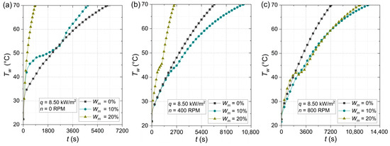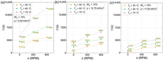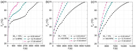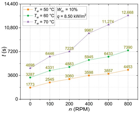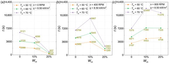Figure 17 presents the holding time required for Tw to reach specific temperatures (50 °C, 60 °C, and 70 °C) at n = 0, 400, and 800 RPM; Wm = 10%; and q = 8.50, 12.75, and 17.00 kW/m2. For any given q, an increase in n results in a longer holding time. For example, when Tw reaches 70 °C, at q = 8.50 kW/m2, the times corresponding to n = 0, 400, and 800 RPM are 4698 s, 9967 s, and 12,668 s, respectively; at q = 12.75 kW/m2, they are 2834 s, 4689 s, and 5941 s, respectively; and at q = 17.00 kW/m2, they are 1615 s, 3064 s, and 3694 s, respectively. Under these three heat fluxes, the holding time at 800 RPM increases by 169.6%, 109.6%, and 128.7%, respectively, compared to that at 0 RPM. This indicates that stirring significantly prolongs the operating time of the heat source below a specific temperature.