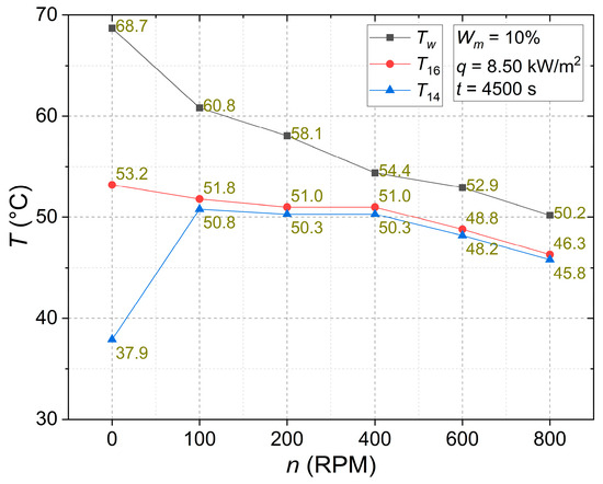 Figure 12 illustrates the temperatures of MPCMS and the heating wall at n = 0–800 RPM, Wm = 10%, q = 8.50 kW/m2, and t = 4500 s. For MPCMS, measurement points include T16 20 mm from the heating wall and T14 60 mm from the heating wall. At n = 0 RPM, the temperature difference between Tw and T16 is 15.5 °C, while the difference between Tw and T14 is 30.8 °C, indicating a significant temperature gradient within MPCMS that limits the melting of the upper portion. As n increases, the temperature gradient decreases markedly. At n = 800 RPM, the temperature difference between Tw and T16 drops to 3.9 °C (a 74.8% reduction compared to that at n = 0 RPM), and the difference between Tw and T14 reduces to 4.4 °C (an 85.7% reduction compared to that at n = 0 RPM). This confirms that stirring effectively reduces the temperature difference between the heating wall and MPCMS, as well as the internal temperature gradient.