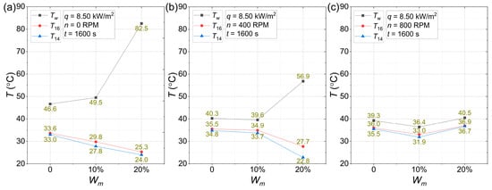 Figure 15 depicts the temperatures of the MPCMS (T16 and T14) and the heating wall (Tw) at n = 0, 400, and 800 RPM; Wm = 0%, 10%, and 20%; q = 8.50 kW/m2; and t = 1600 s. When n = 0 RPM, with increasing Wm, the temperature differences between Tw and T16 and between Tw and T14 gradually increase from 13.0 °C and 13.6 °C at Wm = 0% to 19.7 °C and 21.7 °C at Wm = 10% (increases of 51.5% and 59.6%), and then to 57.2 °C and 58.5 °C at Wm = 20% (increases of 340.0% and 330.1%). Adding MPCM to the base fluid indicates a significant reduction in heat dissipation capacity. When n = 400 RPM, the temperature differences corresponding to Wm = 0% are 4.8 °C and 5.5 °C, those corresponding to Wm = 10% are 4.7 °C and 5.9 °C (changes of −2.1% and 7.3%), and those corresponding to Wm = 20% are 29.2 °C and 34.1 °C (increases of 508.3% and 520.0%), indicating that adding 10% MPCM to the base fluid has a smaller effect on heat dissipation capacity. However, adding 20% MPCM still leads to a substantial decrease in heat dissipation capacity. When n = 800 RPM, the temperature differences corresponding to Wm = 0%, 10%, and 20% are 3.3 °C and 3.8 °C, 3.4 °C and 4.5 °C, and 3.6 °C and 3.8 °C, respectively, indicating that even adding 20% MPCM to the base fluid does not significantly affect heat dissipation. However, as t increases, due to the completion of the solid–liquid phase change, the temperature differences corresponding to different Wm mostly show an increasing trend to varying degrees. Additionally, as n increases, the temperature differences corresponding to different Wm all exhibit a downward trend, indicating that stirring effectively enhances the uniformity of the temperature field.