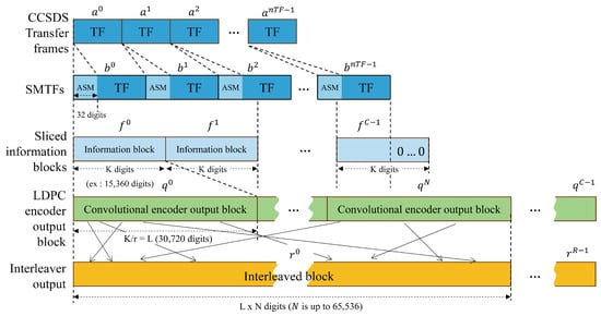 A 32-bit Attached Sync Marker (ASM) of 0x1ACFFC1D is appended to each transfer frame to form Synchronization-Marked Transfer Frames (SMTFs). The SMTFs are then segmented into information blocks of length k according to the selected code rate r. For code rates 1/2 and 9/10, k equals 15,360 and 27,648 bits, respectively. If the final block is shorter than k, zero padding is applied. The total number of blocks becomes , where P denotes padding bits.