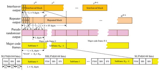At the coding and synchronization layer, fixed-length transfer frames are received from the Data Link Protocol layer and processed into binary vectors suitable for the physical layer interface. Transfer frame adaptation begins with the generation of frames, , derived from CCSDS protocols such as the TM Space Data Link Protocol [19], the Advanced Orbiting System, or the Unified Space Data Link Protocol. Each frame has a fixed bit length defined by the selected protocol.