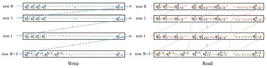 Channel interleaving plays a critical role in mitigating burst errors caused by turbulence. Since the coherence time of atmospheric fading extends over milliseconds—much longer than the duration of a single codeword—block interleaving is applied to distribute bits temporally. Each punctured codeword , with , is written row-wise into an interleaver matrix and read column-wise in blocks of length K, as illustrated in Figure 3. Parameters K and N (interleaving depth) are tuned for memory efficiency and error protection. The total memory requirement is bytes; for , the memory approaches 7.5 GB, and increases to approximately 15 GB when ping-pong buffering is employed. In practice, N is chosen to balance memory constraints with the desired burst-error resilience.