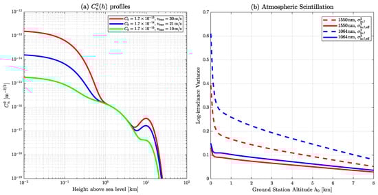 Figure 4 illustrates the altitude-dependent turbulence and its impact on scintillation. In Figure 4a, the vertical distribution of the refractive index structure parameter is shown for different ground-level turbulence strengths and wind speeds. The results demonstrate that ground-layer turbulence dominates near the surface, while stratospheric and wind-shear contributions become more significant at higher altitudes. In Figure 4b, the log-irradiance variance is presented both before aperture averaging, , and after aperture averaging, (the effective log-irradiance variance), for wavelengths of 1550 nm and 1064 nm. The analysis confirms that longer wavelengths experience weaker scintillation and that aperture averaging substantially reduces fluctuations, particularly at low altitudes where turbulence is strongest.