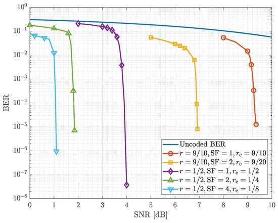 As a baseline, the performance of CCSDS LDPC coding was first examined under AWGN channel conditions. Figure 5 shows the BER curves for coded and uncoded transmissions. Code rate provides strong error correction, exhibiting the expected waterfall behavior at moderate SNR values. In contrast, achieves higher throughput but requires significantly higher SNR for comparable performance, illustrating the fundamental rate–performance tradeoff. The uncoded BER serves as a reference baseline. Here, denotes the effective code rate, which accounts for both the LDPC code rate r and the optional repetition factor through the relation . This parameter is used in Figure 5 to provide a unified comparison across different coding and repetition configurations.