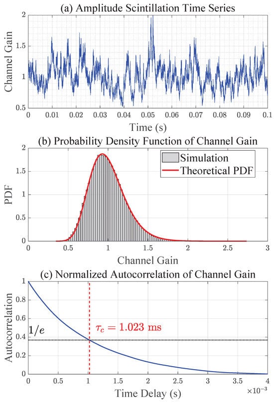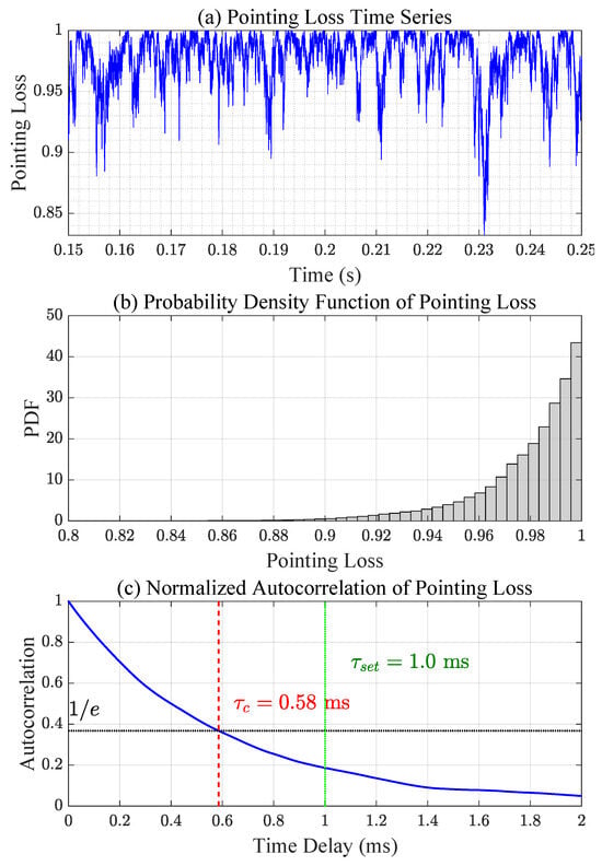 After confirming baseline behavior, the accuracy of the implemented turbulence and pointing models was validated. Figure 6 presents amplitude scintillation results, including time-series evolution, PDF, and normalized autocorrelation. The simulated log-irradiance variance closely matches theoretical predictions, while the autocorrelation function exhibits the expected exponential decay, with the coherence time identified as the delay at which the correlation falls to of its maximum value—a widely adopted criterion in fading channel analysis. Similarly, Figure 7 shows pointing error fading analysis, where the simulated distribution follows the Beta distribution model and the temporal correlation generated by the AR(1) process reproduces realistic jitter dynamics. In this case, the jitter process was generated with a Rayleigh-distributed baseline coherence time of 1 ms (), but due to the nonlinear transformation from jitter to pointing-loss fading, the effective coherence time of is observed to be approximately half that value.