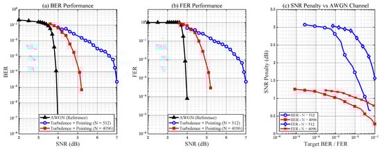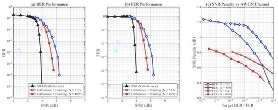 System performance is quantified in terms of the bit error rate (BER), computed as the ratio of incorrectly decoded bits to the total transmitted information bits. In addition, we also evaluate the frame error rate (FER), defined as the ratio of incorrectly decoded codewords to the total transmitted codewords, which provides a direct measure of end-to-end reliability in CCSDS O3K systems. Performance curves are presented as a function of the signal-to-noise ratio (SNR), where the effective SNR is defined as