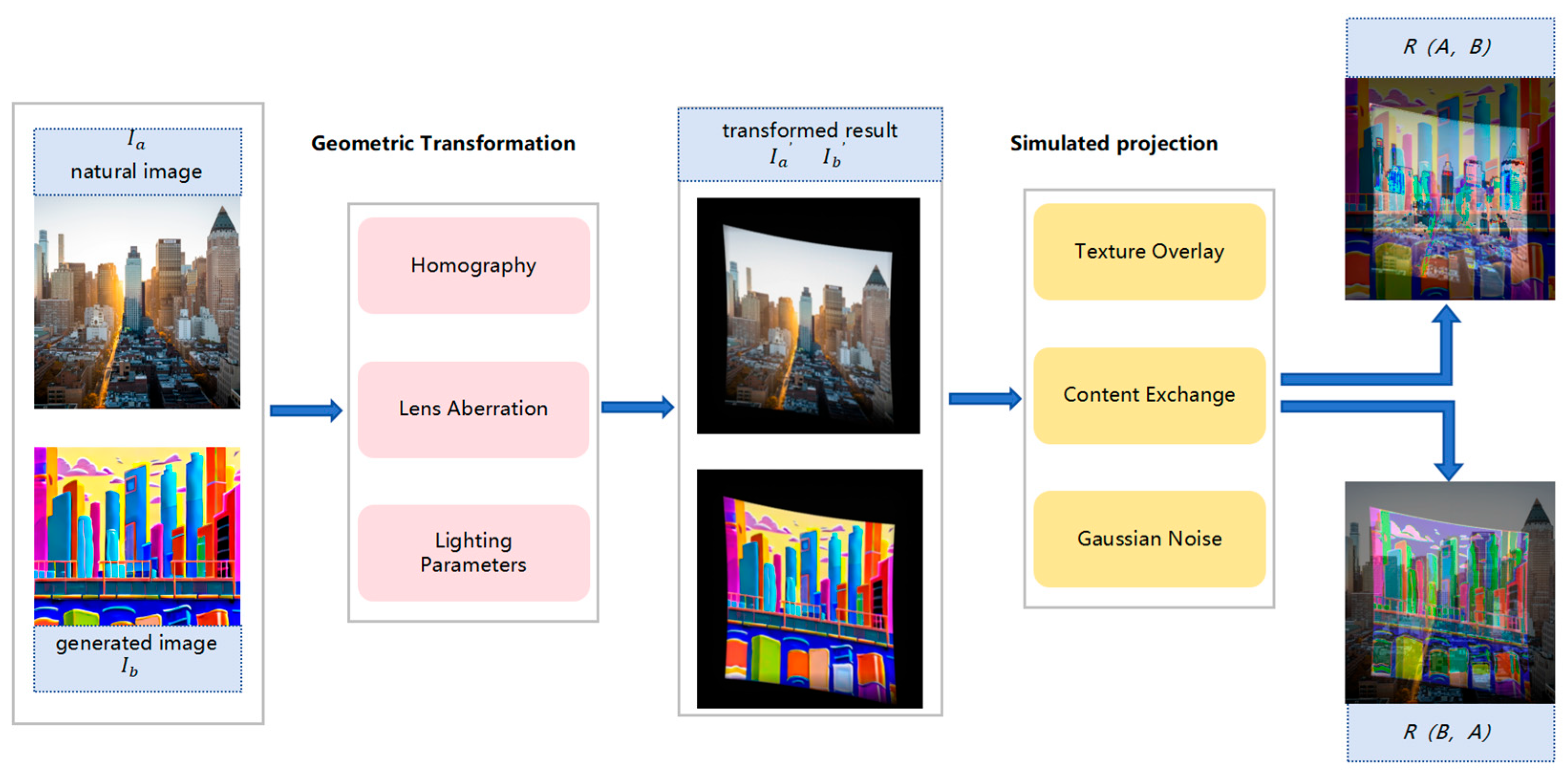 Simulate the real projection through the “bidirectional interchange” strategy: First, map the natural image as the projection content onto the surface of the generated image, and then project the generated image onto the natural scene, allowing the two types of samples to alternate between the foreground and background roles, showcasing the fusion of virtual elements with the real world. Ultimately, we can obtain a pair of projected images and composite images, which represent the projected image and the image captured after being projected onto the object’s surface. This image pairing not only increases the scale of the dataset but also significantly enhances its diversity, allowing it to better represent complex projection scenarios. Moreover, by using natural and generated images as foreground and background, we simulated the relative relationship between the projected content and the target surface in different environments. This setup not only helps simulate projection effects on different surfaces but also effectively models various challenges encountered during real-world projections, such as lighting variations, image distortion, and surface reflections. Through this approach, the dataset more accurately reflects the application of UAV projection systems in dynamic, large-scale, and non-planar scenes, and accounts for the environmental factors that influence real-world projection processes.