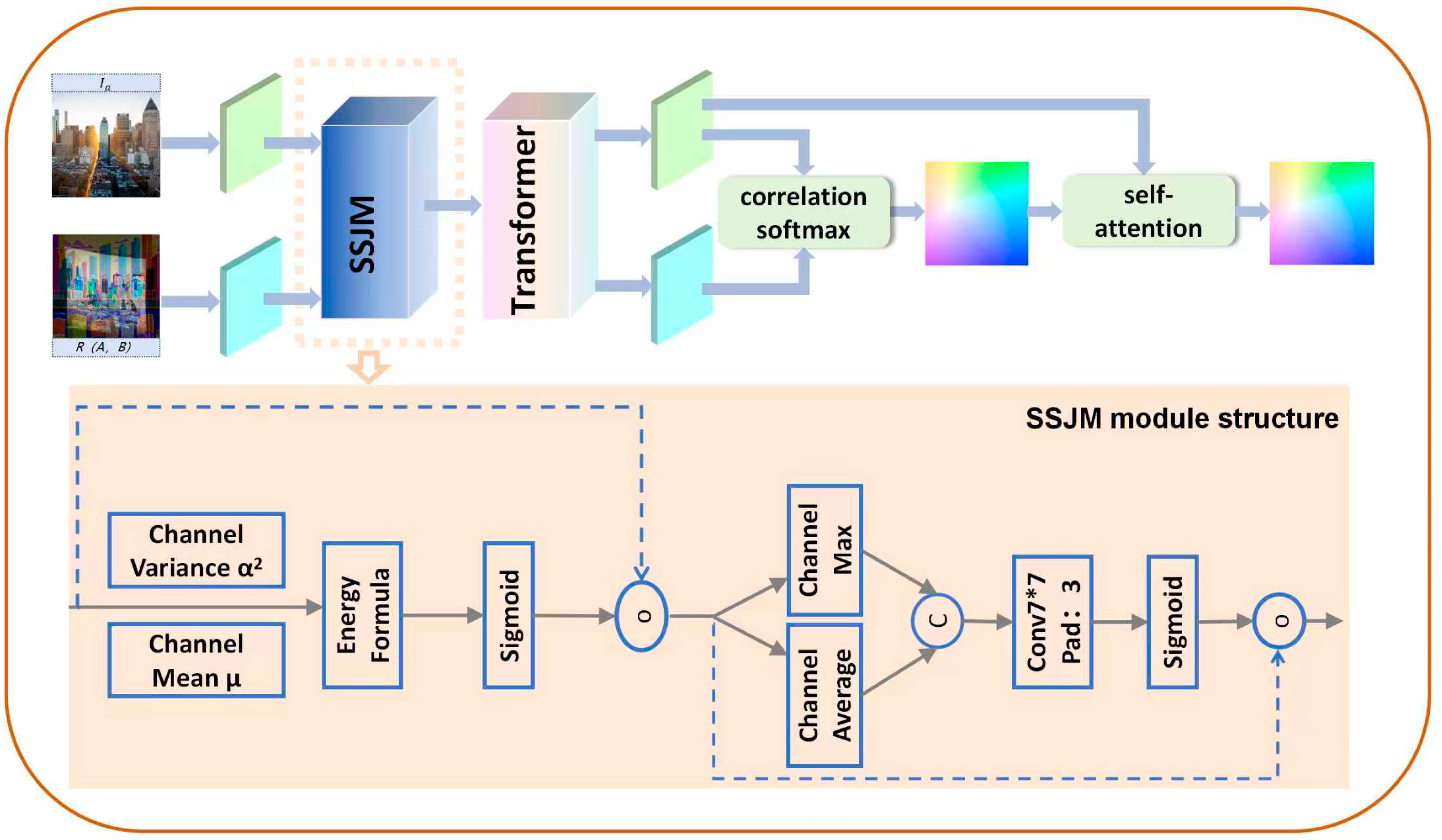 The registration network structure based on global matching and the SSJM module structure. The complete data processing pipeline has been meticulously presented, illustrating the transformation from input composite images to output optical streams. Within this framework, the SSJM module emerges as the cornerstone component of our neural network architecture, demonstrating critical functionality in the geometric correction process.