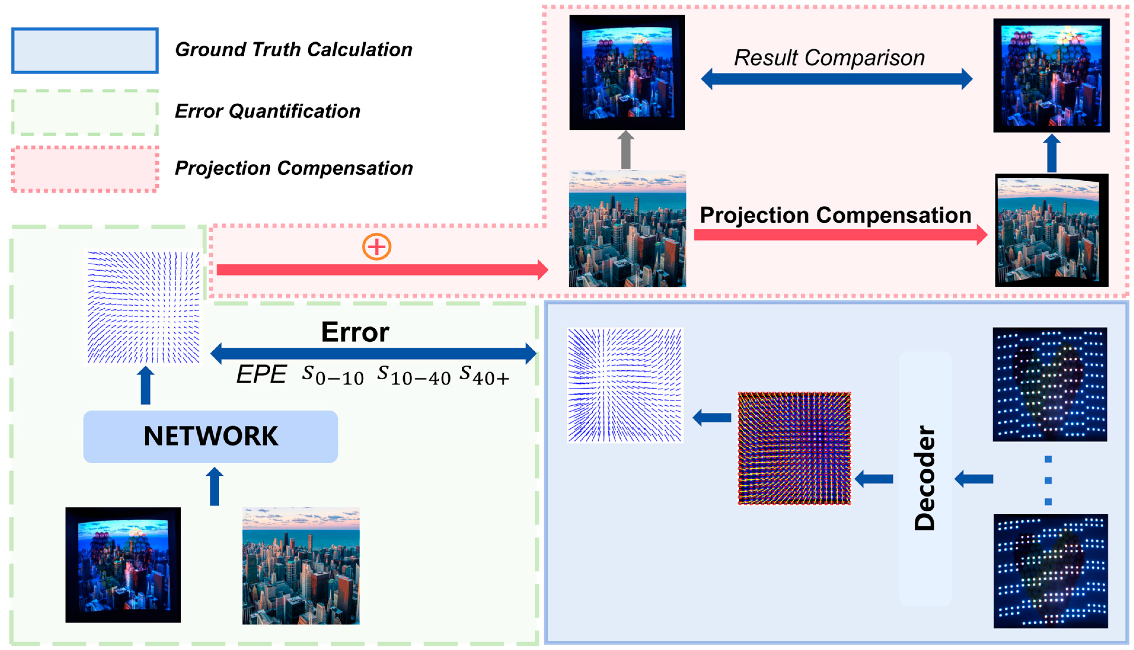 However, achieving high-quality and distortion-free dynamic projection faces a fundamental challenge: the severe geometric distortions caused by dynamic changes and complex shapes of non-planar object surfaces. When a projector, mounted on a fast-moving UAV, projects content onto various non-planar surfaces—some of which may also be in motion—the resulting images often exhibit noticeable warping and stretching. These geometric distortions significantly degrade the visual fidelity and effectiveness of the projected information, becoming a critical bottleneck that limits the practical deployment and visual quality of UAV-based large-scale dynamic projection systems. Traditional projection correction techniques, particularly pre-warping methods designed for static planar screens, struggle to handle such unstructured and dynamic 3D scenarios. These methods are generally incapable of adapting in real time to rapid changes in the relative pose between the projector and the target surface, as well as to the complex geometry of the surface itself. Therefore, there is an urgent need for an innovative approach that can robustly and efficiently correct geometric distortions in real time during dynamic projection. This challenge can be reformulated as a large-motion estimation problem in the domain of global optical flow. By leveraging optical flow algorithms, it is possible to establish dense pixel-level correspondences between the projected image and the target surface during the dynamic projection process. In doing so, complex 3D distortions on non-planar surfaces can be addressed through global matching in the 2D image space, enabling accurate correction of projection geometry in real-world UAV-based systems.