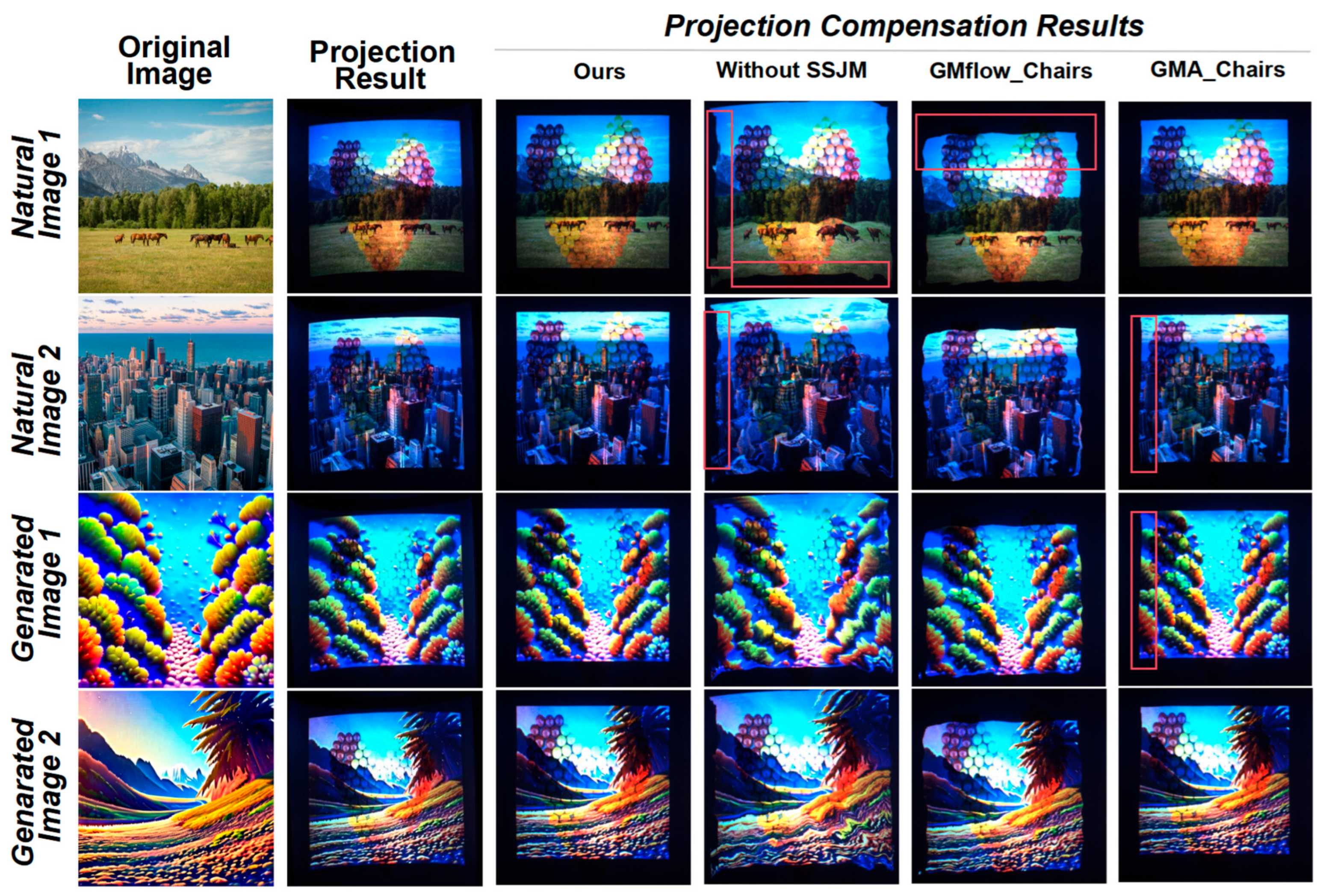 Visualization of projection compensation results for each model in scene 1. The use of controlled variables can provide intuitive insights into the impact of the type of projection subject image, the effect of the SSJM module, and the advantages over other models.