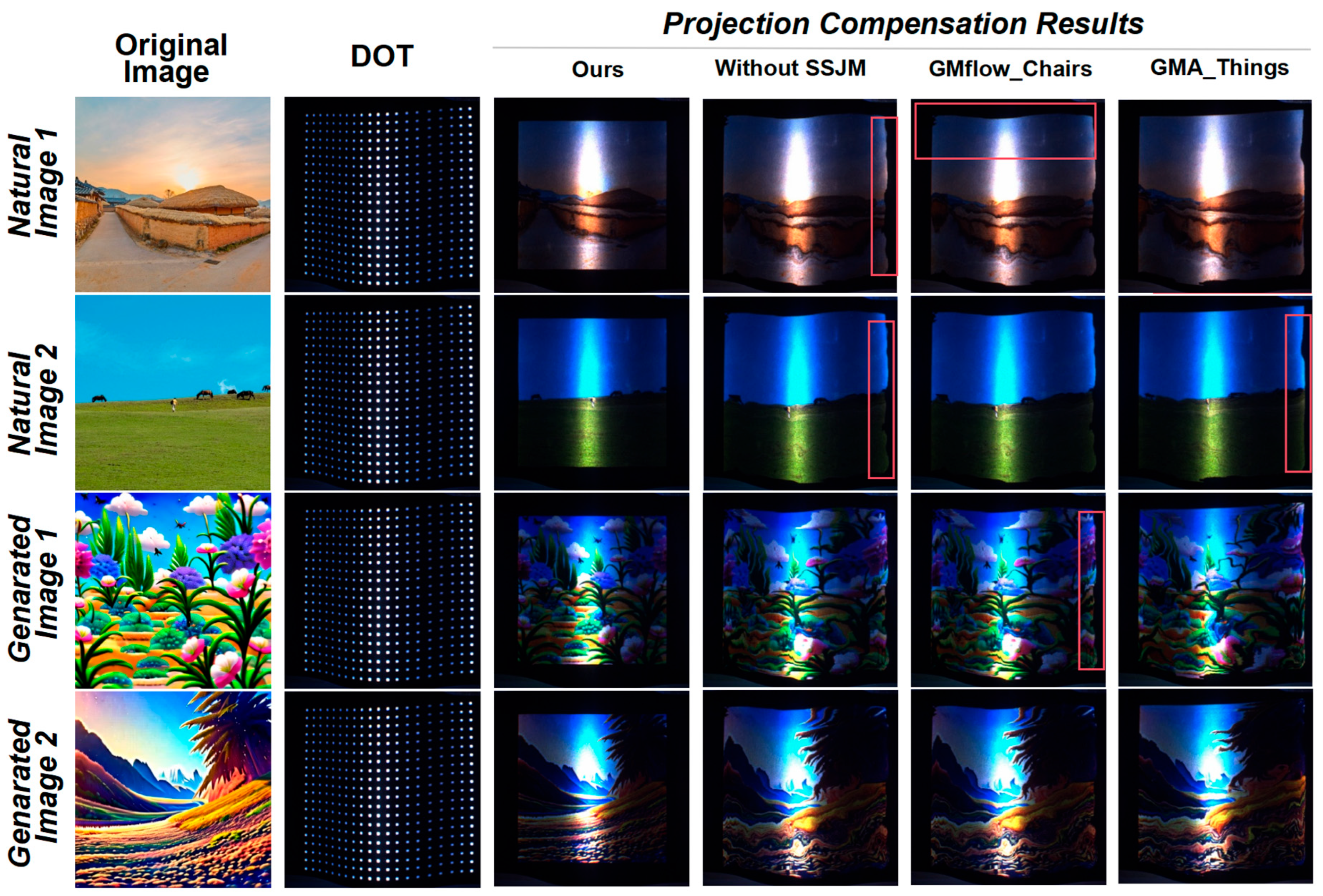 10]. The core idea of our method is to reformulate the dynamic geometric mapping between the projected image and the non-planar target surface as a dense optical flow estimation task. By leveraging the powerful global context modeling and feature matching capabilities of Transformer and the proposed SSJM module [