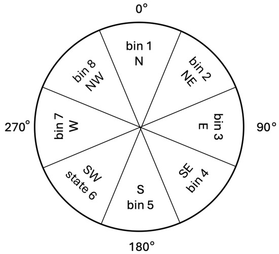 The data is aggregated by a quarter of an hour, meaning that each year results in 35,040 instances of data; overall, we have 70,080 datapoints for each airport. The features included in the analysis are hour of day, wind conditions (direction and speed), cloud ceiling, visibility, arrival demand, and departure demand. Wind direction is categorized into eight bins as shown in Figure 1, wind speed is categorized into six bins (0–5, 5–10, 10–15, 15–20, 20–25, >25 knots), cloud ceiling is categorized into five bins (0–2500, 2500–7500, 7500–15,000, 15,000–30,000 feet, and no ceiling), visibility is categorized into five bins (0–3, 3–6, 6–7.5, 7.5–9, ≥10 miles), and arrival/departure demands are categorized into four bins (0–10, 10–20, 20–30, >30 aircraft). To properly evaluate the effectiveness of the implemented techniques, the entire dataset is divided into 80% training and 20% testing sets, randomly, and each of the techniques are applied only to the training set, keeping the testing set representative of real-world unseen data.