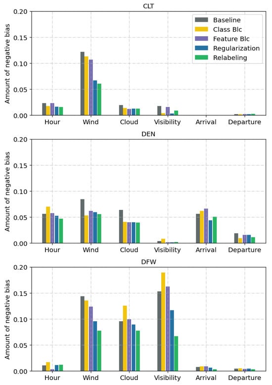As is illustrated in the figure, most of the existing negative biases under high wind conditions (more than 10 knots) have resolved after applying the relabeling technique for all airports, and the majority of the existing negative bias lies in the realm of calm wind conditions. This is a major finding since, for runway configuration management, key decisions are the ones that happen in the high wind conditions, and the choice of runway configuration in the calm wind conditions is not as important. A lot of other factors can affect the decision-making in calm wind conditions that are not present in the input data, such as operational procedures, noise abatement procedures, airline preferences, and the proximity of the runways to the terminals. Hence, the aggregate mitigation of bias reported in this paper represents the mitigation in general settings, while, in the cases of high wind conditions, the mitigation effects are more significant. Another observation in the case of CLT is that the majority of the remaining negative bias is in the cases of eastward and westward winds, which, due to the north–south orientation of the runways at this airport, the model has no mechanism for addressing the existing bias.