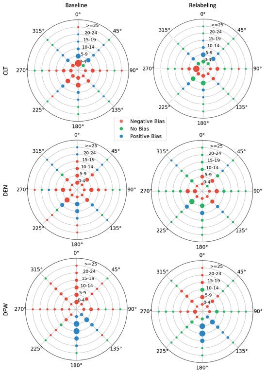 Although there still remain significant amounts of negative bias, even after applying a bias mitigation technique, we noticed that the majority of such bias exists in calm wind conditions (wind speeds less than 10 knots). Figure 3 shows the visualization of existing bias (green for no bias, red for negative bias, and blue for positive bias), before (left panel) and after (right panel) applying the relabeling technique to the RCA tool in the cases of CLT (top panels), DEN (middle panels), and DFW (bottom panels). In this figure, wind directions are shown as a radian plot (degrees from north), wind speed is shown as the distance from the center of the circle, and sizes of dots represent the amount of data that is in the training set for each category.