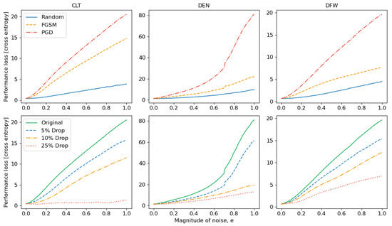 In this section, we quantify the robustness of the RCA tool to random noise and two types of adversarial noise, FGSM and PGD. Then, the perturbed data are included in the training process of the RCA tool and the improvements in the robustness of the model to these sources of noise is quantified. Figure 4 (top panel) shows the drop in performance of the RCA tool (in terms of increase in the cross-entropy loss) as a function of the magnitude of each source of noise, e, as defined in Equations (2)–(4). As expected, PGD has significantly more impact on the model performance compared to the other two approaches, followed by FGSM. In Table 3, three stages of the drop in the performance of the model are identified, i.e., 5%, 10%, and 25%, finding the smallest magnitude level of each noise that causes such a drop in the performance (these values are averaged among the three airports).