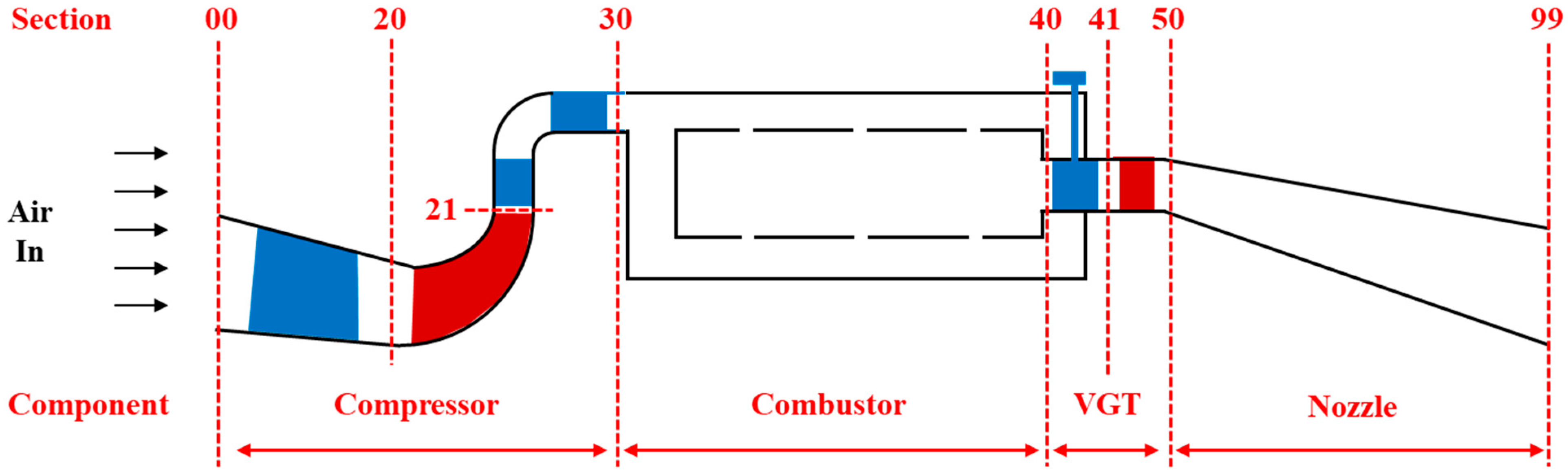 - You, D.; Kalitzin, G.; Herrmann, M.; Ham, F.; Pitsch, H.; van der Weide, E.; Alonso, J. Integrated Computations of an Entire Jet Engine. In Proceedings of the ASME Turbo Expo 2007: Power for Land, Sea, and Air, Montreal, QC, Canada, 14–17 May 2007; Volume 6: Turbo Expo 2007, Parts A and B, Paper GT2007-27094. pp. 299–308. [Google Scholar] [CrossRef]