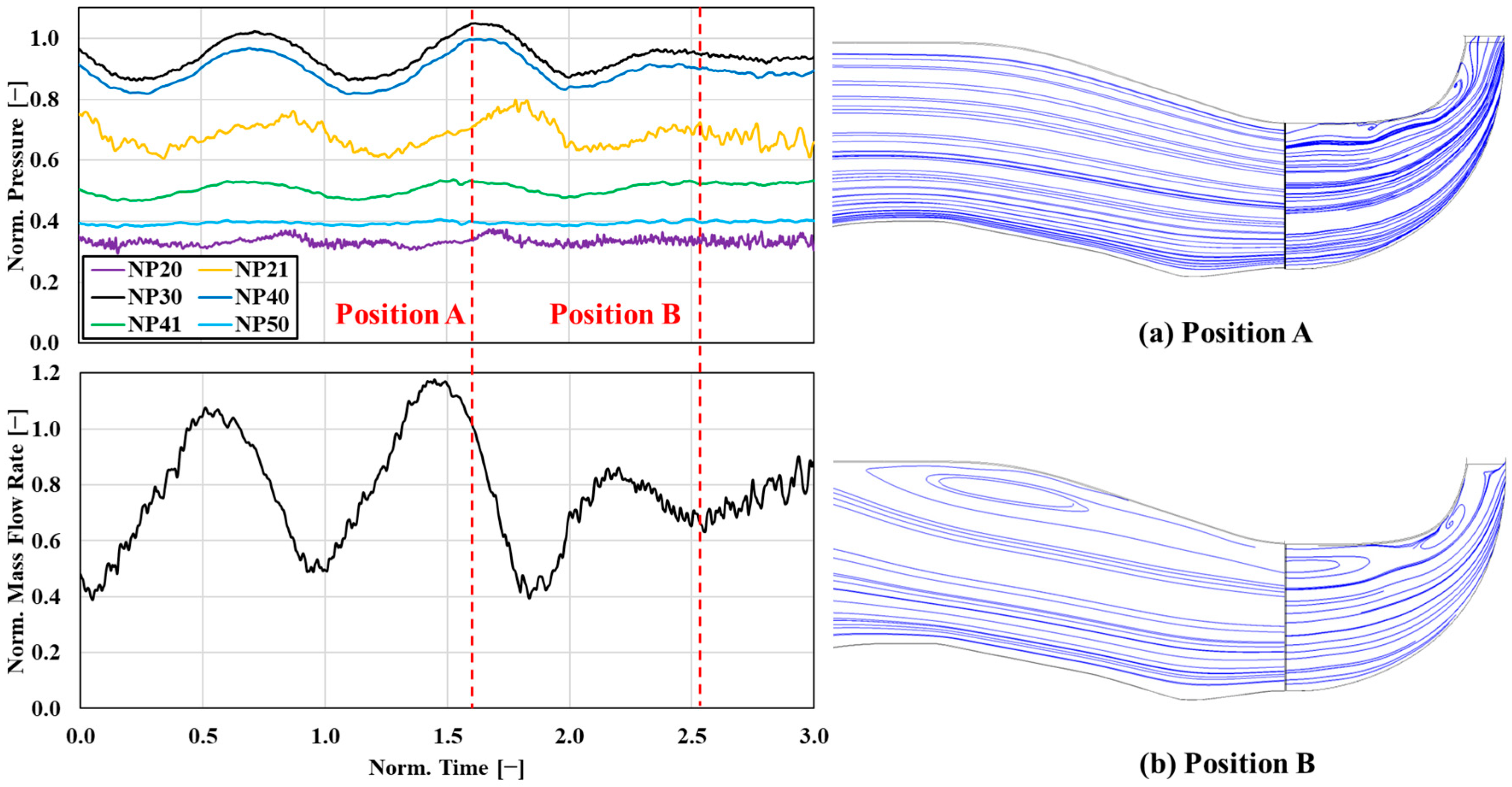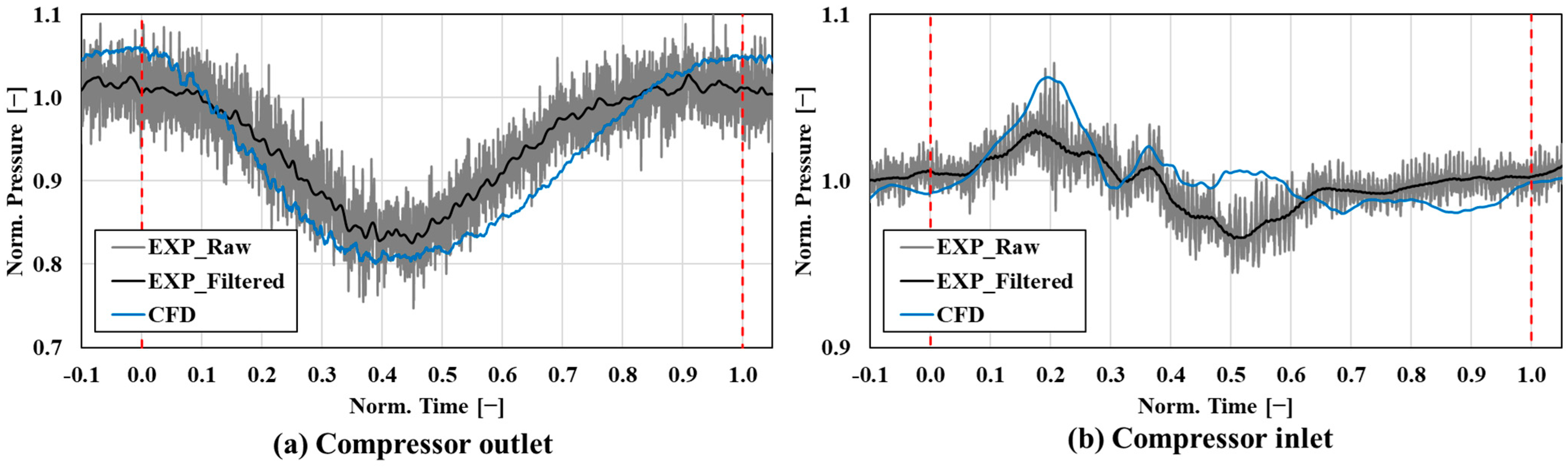 - Through analysis of experimental and simulation results, it is concluded that the full-engine three-dimensional URANS method used in this study can capture the performance changes, surge boundaries, and main flow parameters during surge across the whole engine speed range. For engines with size configurations similar to the engine studied in this paper, the prediction accuracy of this method for surge frequency, pressure fluctuation amplitude, and surge boundary is on the order of 6%. This method can be used to obtain engine surge characteristics in the early design stage accurately, does not rely on additional empirical parameter calibration, and can replace part of the engine surge tests, reducing research costs.