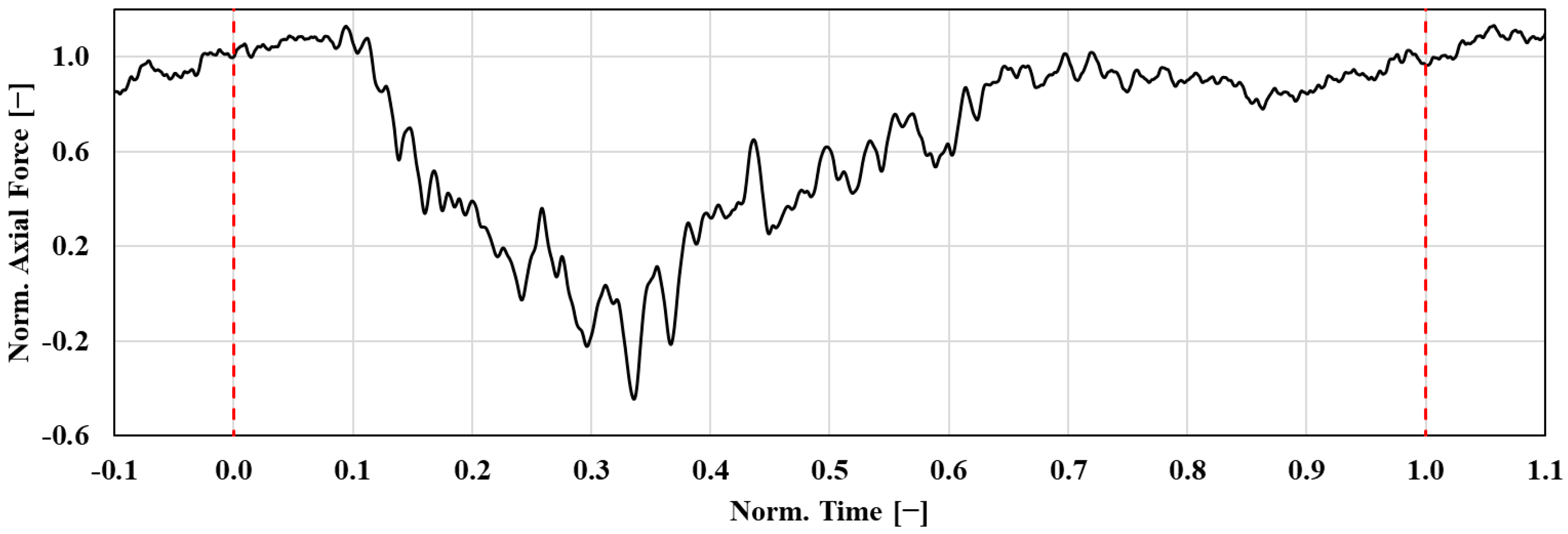 - The engine surge characteristics are obtained through the adjustment of the variable geometry turbine in the simulation results. During the surge, compressor inlet and outlet pressures exhibit periodic changes, but the minimum flow rate does not reach a negative value in the inlet passage. The engine studied in this paper enters a mild surge state. During the surge, the changes in aerodynamic forces on all blade rows are not significant. However, the axial aerodynamic forces on the engine rotor system reverse their directions. The maximum reverse axial force exerted on the rotor system is 0.6 times the axial force before the surge inception.