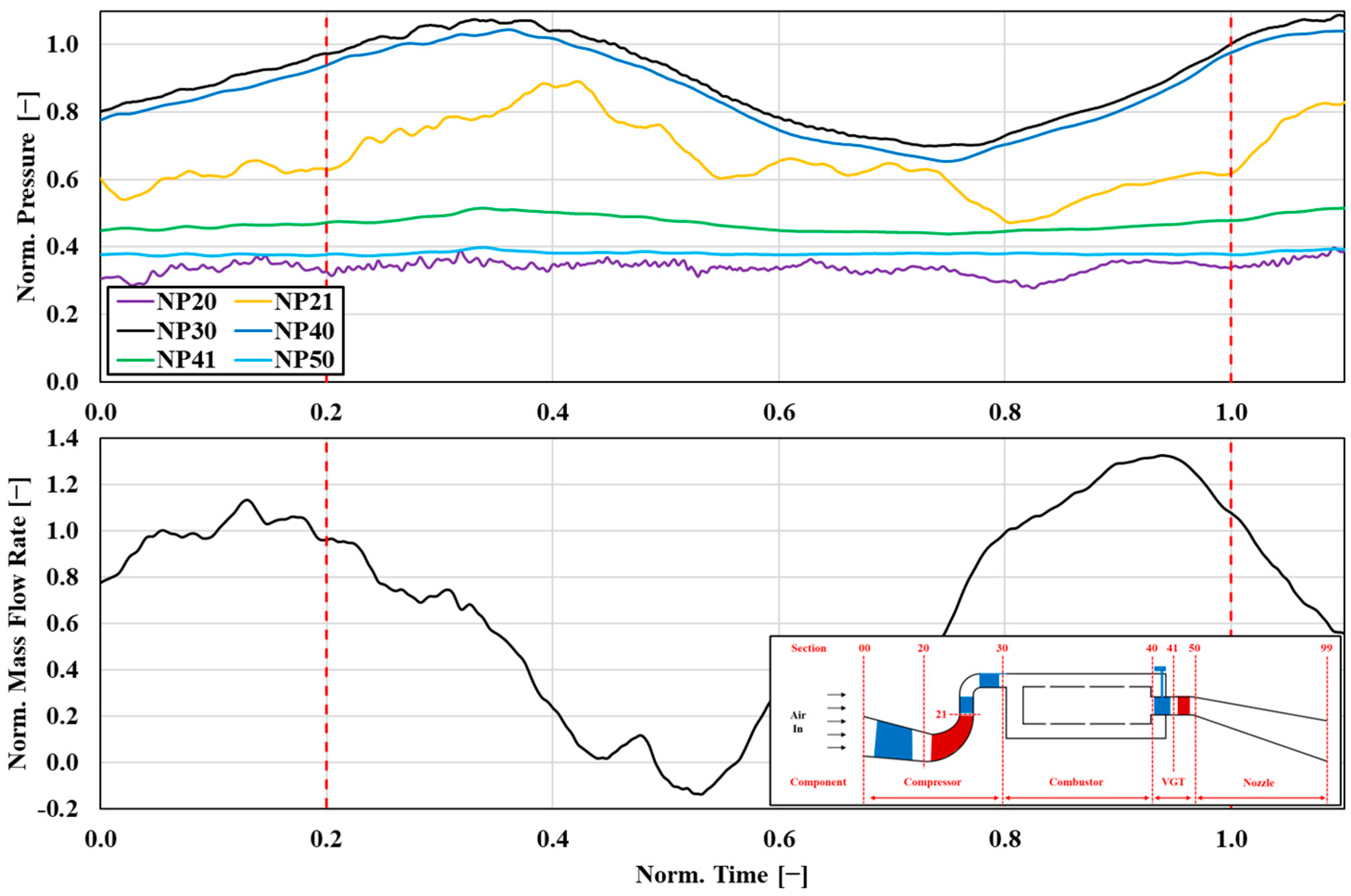 - In the engine environment, the centrifugal compressor still exhibits the evolution trend of two-regime surge previously reported in component-level studies. In the small turbojet engine studied in this paper, when gradually closing VGTS vanes, the compressor sequentially enters mild surge and then recovers from it. If the exhaust temperature limits are lifted in simulations, the engine then progresses into a deep surge. In the practical applications, the engine becomes inoperable beyond the mild surge state; thus, the mild surge inception point should be defined as the engine’s stability boundary.