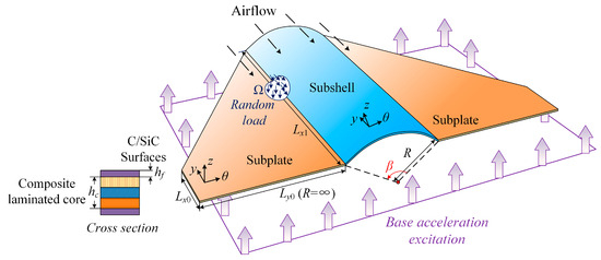 The plate–shell coupling structure is a common prototype in the design of high-speed aerospace vehicles [1,2,3,4,5,6], consisting of a pair of symmetrical quadrilateral subplates to constitute the wing surfaces and a subshell to assemble the fuselage. With the rapid development of new materials and the continuous lightweighting of structural design, the velocity of aircraft must be further improved to meet the rapid iteration requirements of engineering. Therefore, the aerodynamic load caused by supersonic airflow will not only lead to flutter of thin-walled surfaces when a certain level is reached, but will also further amplify the dynamic instability of the structure if it is subjected to any other external excitation [7], especially stochastic vibration behavior under harsh working conditions. The stochastic loads can be generally classified as base acceleration excitation in the frequency domain and random forces in the time domain with uncertain amplitude [8,9,10,11,12]. Since a subplate and a subshell may exhibit different time–frequency characteristics in the face of stochastic excitation [13], it is necessary to conduct a full-domain stochastic dynamic analysis for a plate–shell coupled structure and consider the problem of fluid–structure interaction [14,15] to investigate the comprehensive time–frequency characteristics in supersonic airflow. Also, a basis for the subsequent study of precise coupling models and any random vibration response is provided.