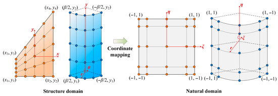 The number of two-dimensional Chebyshev polynomials m × n is equal to the number N of meshless nodes of the discretized structure. In view of the polynomial defined in [−1, 1], each node on the physical substructure is required to be mapped to the corresponding square natural domain as shown in Figure 2. From Ref. [47], the mapped coordinates x(x, y) can be obtained by placing a shape function that is not zero at the selected node xi(xi, yi) as