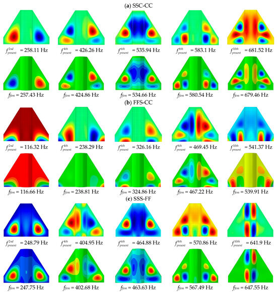 Furthermore, the stochastic load in the time domain is treated as global excitation in each node if there is no additional explanation. In the subsequent verification cases and parameter analysis, the node configuration scheme based on the meshless technique is arranged as 15 × 15. The boundary conditions applied to the coupled structure are symmetrical, so the definition can be given in the order of left subplate and middle subshell. For example, SSC-CC means that the trailing edge and external edge on the subplate are S, while the front and back of the subshell are clamped. In Figure 3, the 2nd- to 10th-order mode shapes and the corresponding meshless frequency values under three types of boundary conditions are listed. It can be seen that the maximum error between the results from the FEM computation does not exceed 1%, and the mode shapes are also consistent with the simulation.