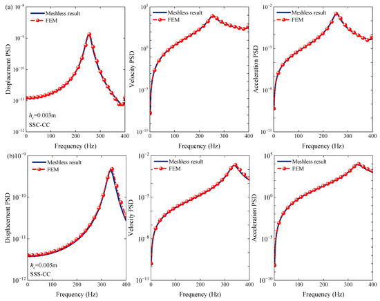PSD responses comparisons of plate–shell coupled structures with different core thickness under base acceleration excitation. (a) hc = 0.003 m; (b) hc = 0.005 m.