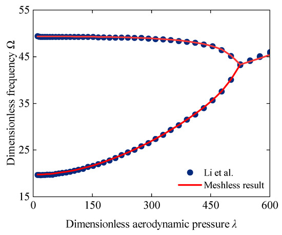 Finally, the meshless flutter boundary under supersonic airflow is compared with the published literature. The parameters of the case reproduced are given as a simply supported square plate with Lx = Ly = 0.305 m and h = 0.0013 m, and the material is also given as E = 68.9 GPa, μ = 0.3 and ρ = 2764 kg/m3 [36]. In addition, the dimensionless frequency are defined as , and the aerodynamic pressure in this study is defined as . The curves in Figure 6 show that the frequency variation and the critical flutter boundary under aerodynamic loads predicted in this study fit perfectly with the reported results, which proves the effectiveness of the aeroelastic model established by the meshless method.