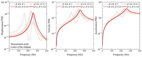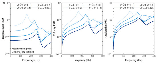 Variations in PSD responses under different central angles β. (a) The PSD responses at the center of the subplate; (b) the PSD responses at the center of the subshell.