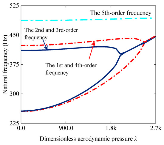 Variations in the first five-order natural frequencies under aerodynamic pressure.