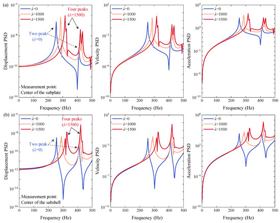 Variations in the PSD responses under different aerodynamic pressure λ. (a) The PSD responses at the center of the subplate; (b) the PSD responses at the center of the subshell.