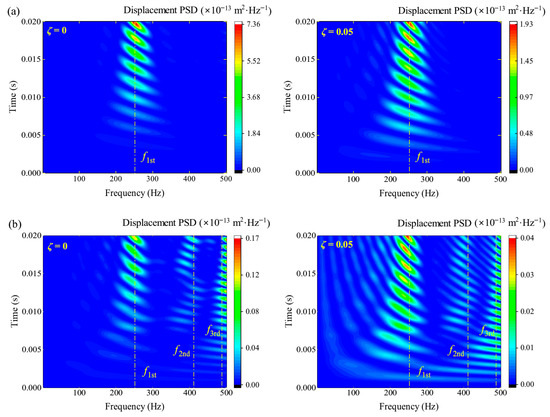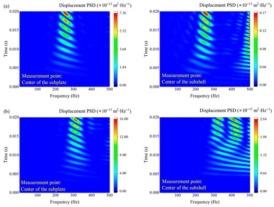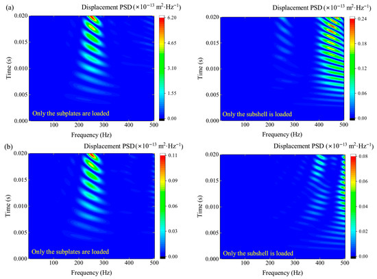 In the following subsections, the time–frequency characteristics of the structure under time-domain stochastic load in the same frequency band are investigated. In order to avoid special results and restore the actual loading conditions as much as possible, the excitation area covers every point on the plate–shell coupled structure. In the current case, the modal damping is re-enabled to compare the evolving PSD distribution on each substructure horizontally. By longitudinally comparing the responses at the center of the subplate and subshell in Figure 10 first, it can be clearly seen that the response amplitude on the subshell is weaker than that on the subplate, and the evolving PSD presented by the two types of substructures is different within the excitation band covering the first three fundamental frequencies of the system. On the subplate shown in Figure 10a, the resonance region of the evolving PSD is only concentrated near the first-order frequency of the system, and there are no other secondary peaks that can be observed in the rest of the frequency band. However, more PSD resonance peaks at each order frequency can be observed on the subshell, and the amplitude without a damping effect at the third order frequency is more prominent. Combined with the inherent properties of the system, this phenomenon can be attributed to the fact that the mode shapes corresponding to the first to second natural frequencies are mainly reflected on the subplate, while the third frequency is reflected on the subshell. Even so, it can be found that the subshell subjected to stochastic excitation is more prone to resonance in the time domain, which is more sensitive than the subplate.