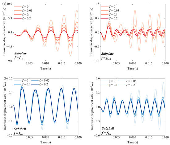 Time history responses of a separately excited substructure at different damping ratios under the first–second frequency excitation of the system. (a) The responses on the subplate; (b) the responses on the subshell.