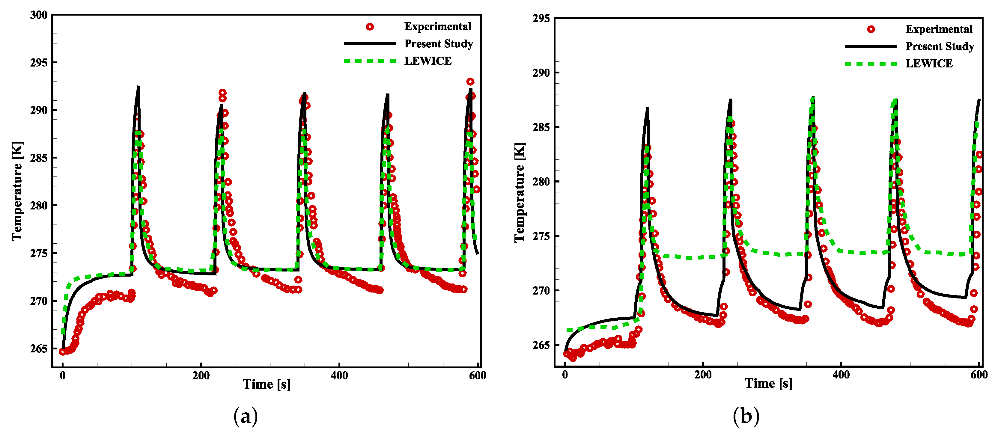 - Shen, X.; Wang, H.; Lin, G.; Bu, X.; Wen, D. Unsteady simulation of aircraft electro-thermal deicing process with temperature-based method. Proc. Inst. Mech. Eng. Part G J. Aerosp. Eng. 2020, 234, 388–400. [Google Scholar] [CrossRef]