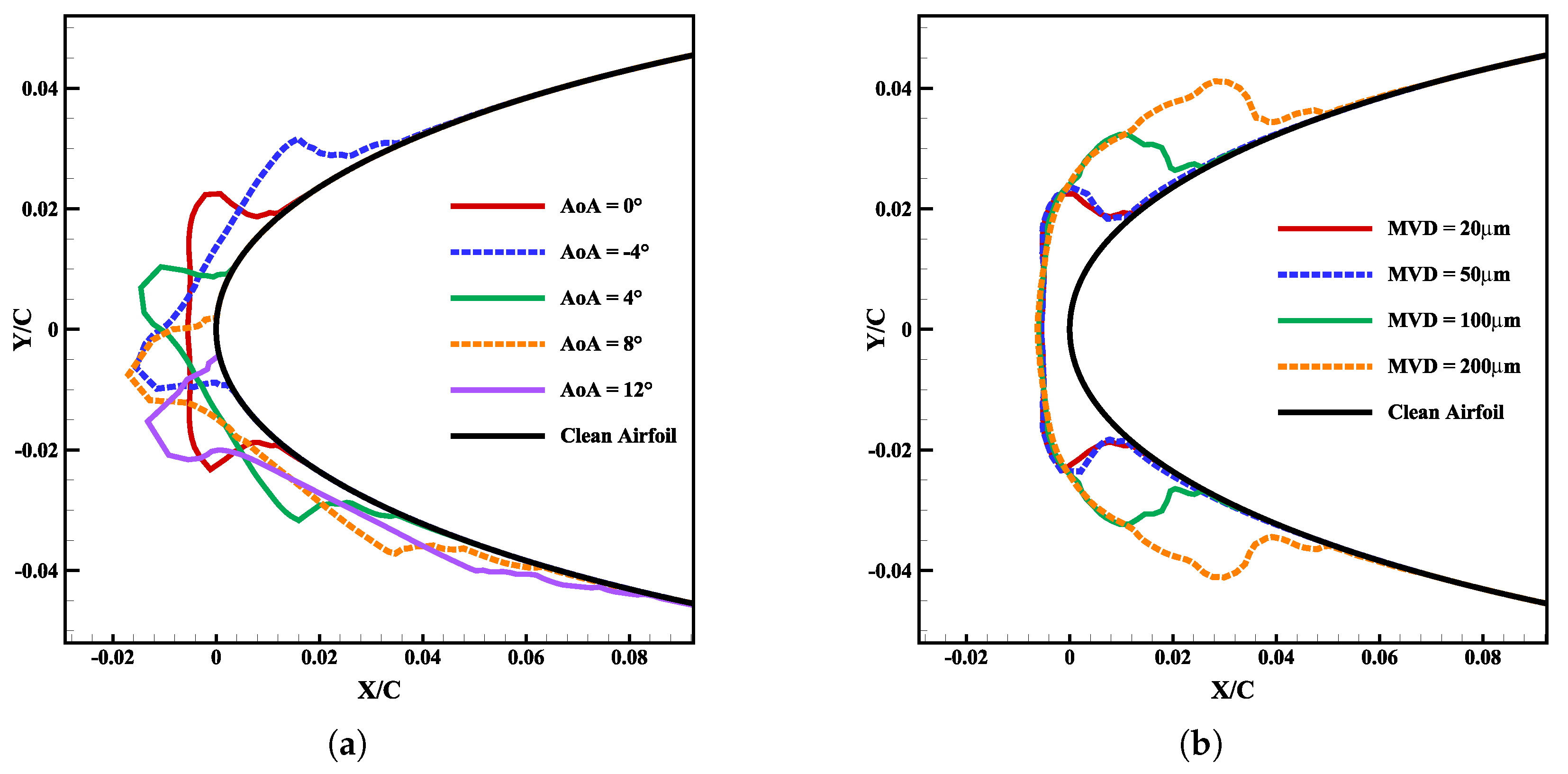 - Nath, P.; Lokanathan, N.; Wang, J.; Benmeddour, A.; Nichman, L.; Ranjbar, K.; Hickey, J.P. Parametric investigation of aerodynamic performance degradation due to icing on a symmetrical airfoil. Phys. Fluids 2024, 36, 075117. [Google Scholar] [CrossRef]