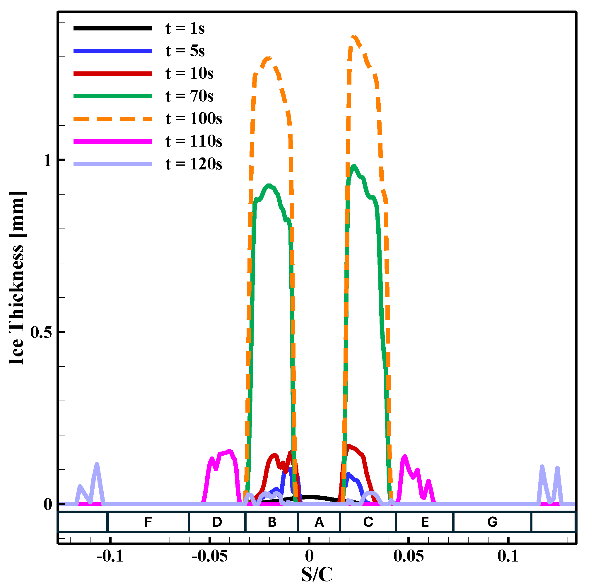 - Zhang, C.; Wang, F.; Kong, W.; Liu, H. The Characteristics of SLD icing accretions and aerodynamic effects on high-lift configurations. In Proceedings of the 33rd AIAA Applied Aerodynamics Conference, Dallas, TX, USA, 22–26 June 2015; p. 3385. [Google Scholar]