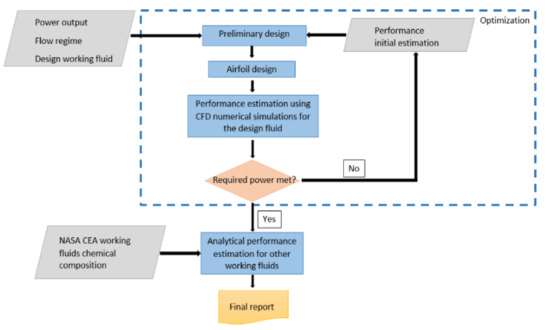 Due to the small size of the blades, aerodynamic stacking is simplified by extruding the mid-span airfoil along the radial direction. This approach neglects radial geometric variations and does not involve a through-flow calculation. Following the preliminary design, the airfoil shape is developed to define the mid-span profile and complete the turbine geometry. This step can be carried out in any CAD software, allowing some design freedom, provided the geometric constraints and computed flow parameters are respected. A method for constructing simple airfoils using line segments and circular arcs is described in [23]. Once the turbine geometry is defined, its performance with the nominal working fluid is evaluated using CFD (Computational Fluid Dynamics) simulations or experimental testing. If the power output meets the target within acceptable margins, the method proceeds to assess performance with alternative working fluids. Otherwise, the design loop is repeated, using the CFD-derived efficiency as the new baseline for the preliminary design. Figure 2 presents a detailed workflow of the methodology. Additional design considerations, geometric outputs, and nominal performance evaluations are discussed in [23,24].