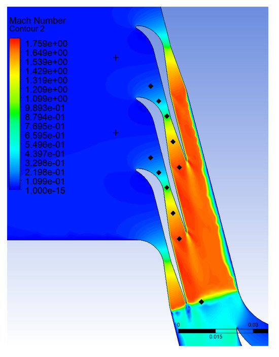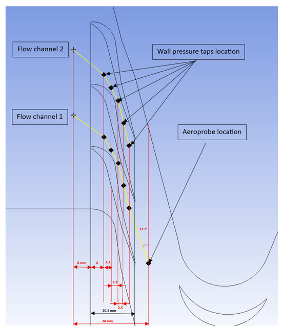 The wall pressure measurements were conducted on both of the two inner stator flow channels included in the experimental model, the two out of four channels not having an external wall. Each instrumented channel was equipped with five wall pressure taps positioned at axial locations along the channel centerline, following a representative streamline, as depicted in Figure 4. Their location included two in the subsonic section, one at the throat (critical area), one mid-way through the divergent section, and one near the stator exit.