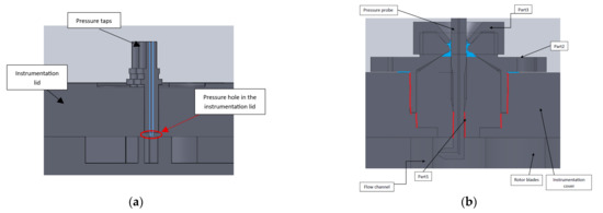 Total pressure at the stator outlet was measured using a calibrated supersonic five-hole Aeroprobe, mounted between the stator and rotor rows (Figure 5b). The probe has a diameter of 3.2 mm, and the section area where it was mounted was 1120 mm2. This resulted in a blockage of 0.7%. To secure the probe and prevent pressure leakage, a custom sealing device was designed. The device has two symmetrical parts, allowing attachment without sliding along the probe. Inside is a variable-diameter hole: the smaller end ensures a smooth boundary, while Part1 fits tightly into Part2. A conical surface compresses sealing material inward, creating a tight seal. Part2 (unsplit) is mounted by angling the probe through its center hole. Part3, threaded over Part2, controls the sealing material and prevents excess that could weaken the joint. Two sealing zones (in blue in Figure 5b) ensure pressure retention: a simple gasket, and a secondary seal that also supports and stabilizes the probe. Red-marked faces are used for centering the assembly.
