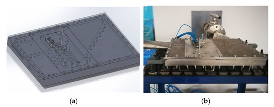 The test assembly was designed with consideration for the nominal operating regime, the simplifications outlined previously, and the need to measure static pressure distribution along the stator channel. Given the compact size of the experimental model, the integration of instrumentation for detailed flow measurements within the stator row—essential for validating turbine performance, which was addressed early in the design phase. Additional details regarding the instrumentation setup are provided in Section 3.2. The first step involved defining the geometry of the planar flow domain. This domain features an axial inlet and a tangential outlet, allowing the flow to expand freely (see Figure 3a). Four stator blade channels, along with a corresponding number of rotor blades, were selected for investigation. The domain height was set to match the original blade height from the turbine design, of 10 mm. The walls adjacent to the stator and rotor were shaped to replicate the pressure and suction sides of the respective blades. Due to the small scale of the stator blades, they were directly machined into the flow domain. The finalized experimental model is illustrated in Figure 3b.